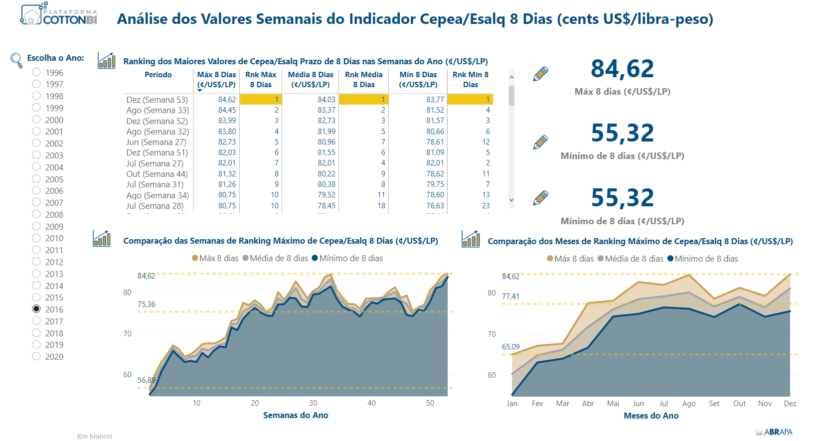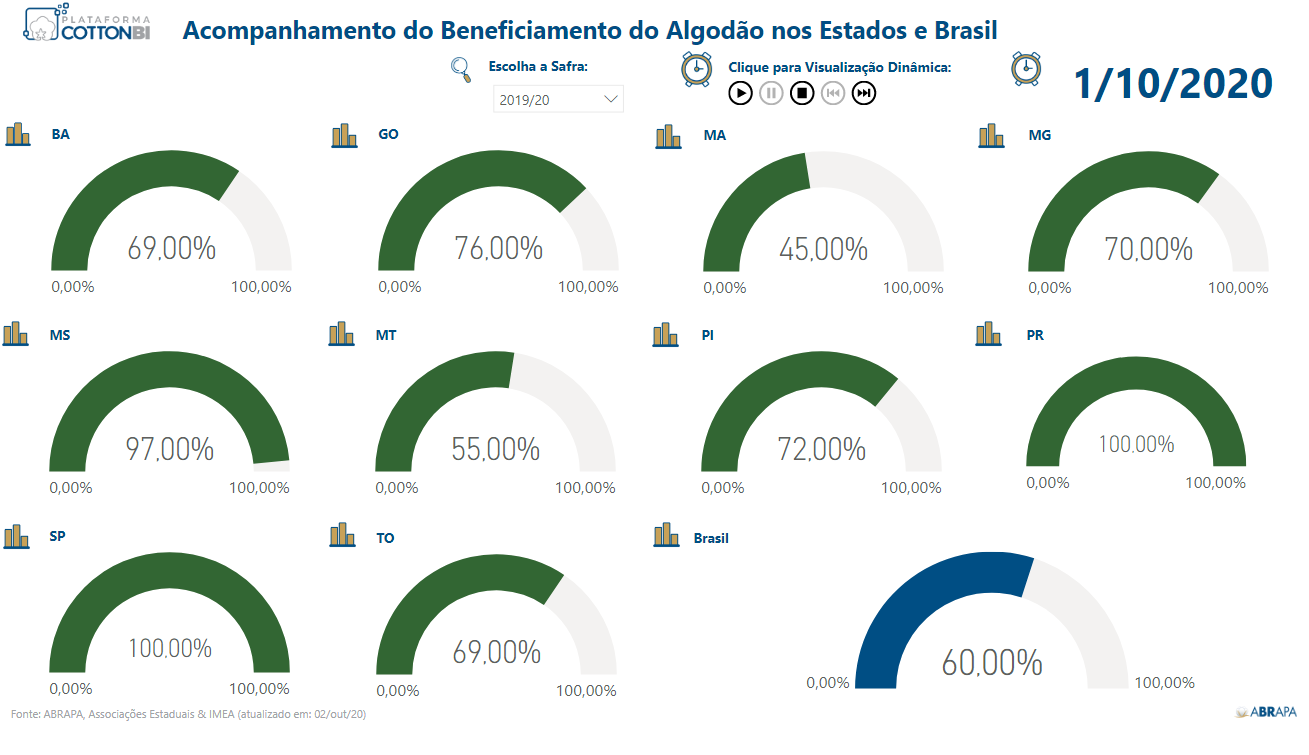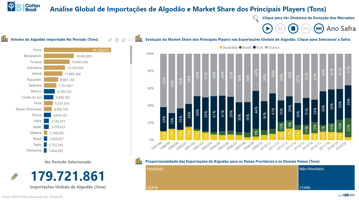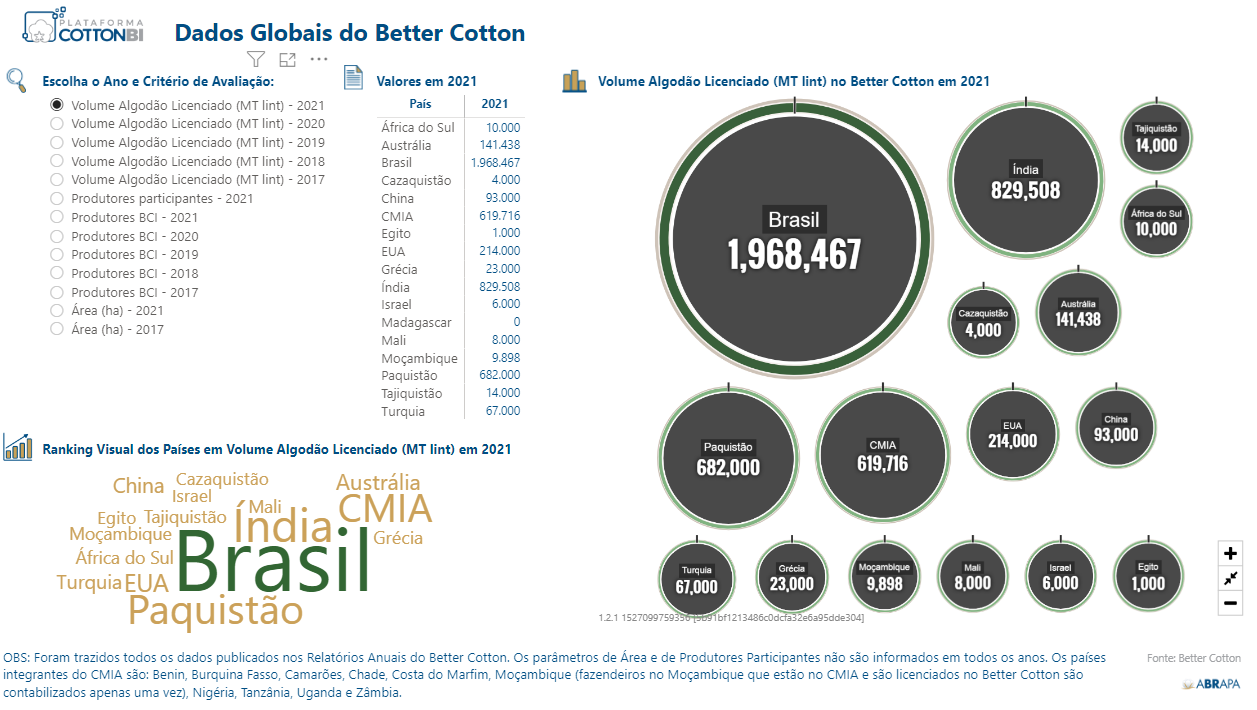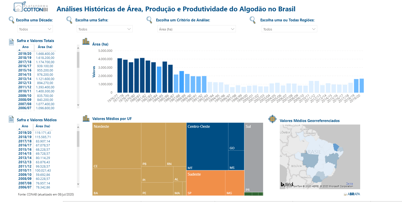 Esta plataforma de Business Intelligence é uma ferramenta gerencial que reúne as principais informações e indicadores da cadeia do algodão no Brasil e no mundo, e foi cuidadosamente elaborada para auxiliar os gestores do setor nas melhores tomadas de decisão de negócios baseadas em dados.